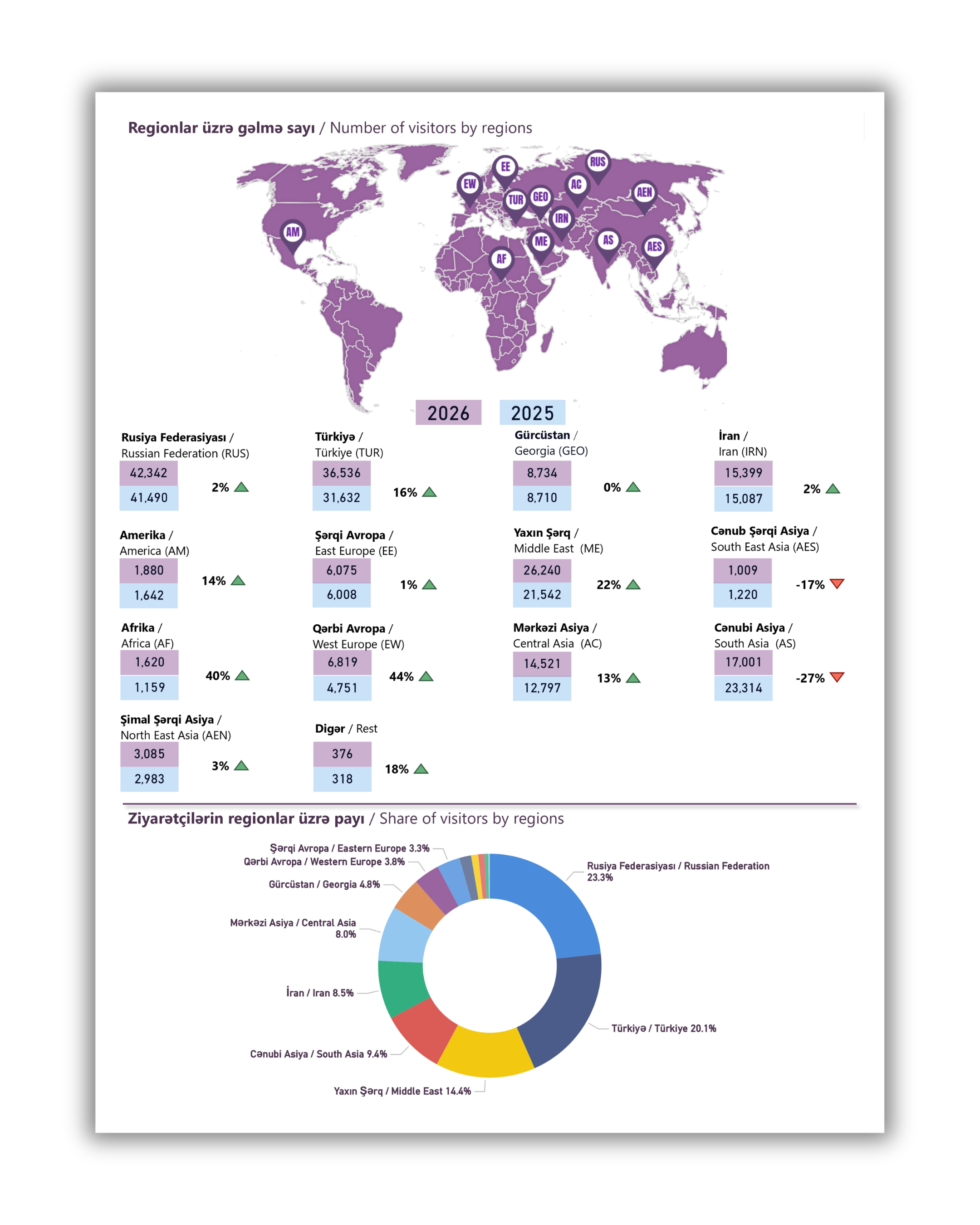 Regionlar üzrə dinamika göstərir ki, Yaxın Şərq ölkələrindən gələnlərin sayı 22% artaraq 26 240 nəfərə, Qərbi Avropa ölkələrindən gələnlərin sayı isə 44% artaraq 6 819 nəfərə çatıb.